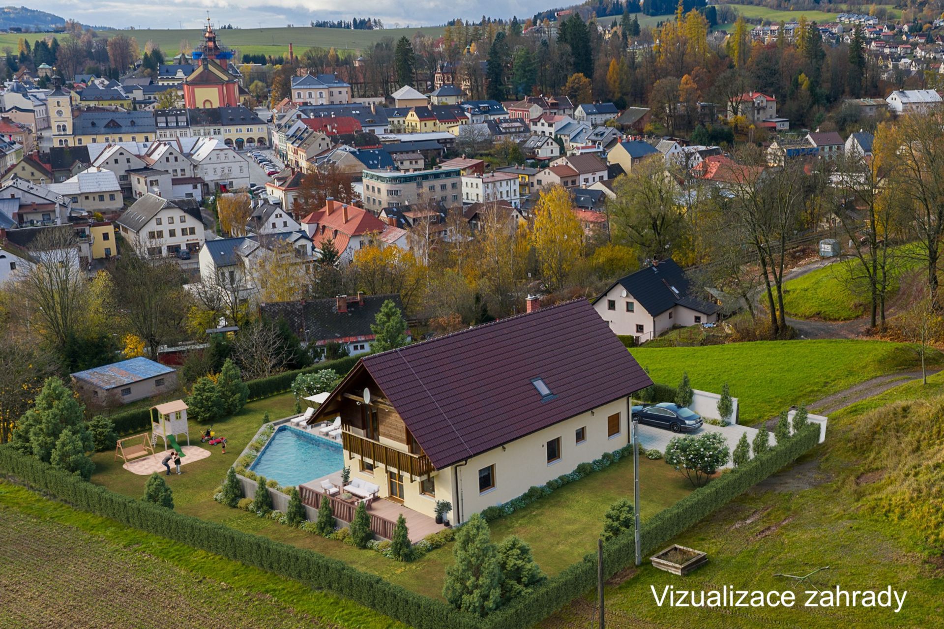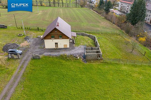 Zahrada zatím není dokončena. Nový majitel si tak může venkovní prostor přizpůsobit podle svých představ. Okolí domu nabízí naprostý klid a soukromí, ideální pro rodinné bydlení i rekreaci, přesto v pěším dosahu centra a veškeré občanské vybavenosti.